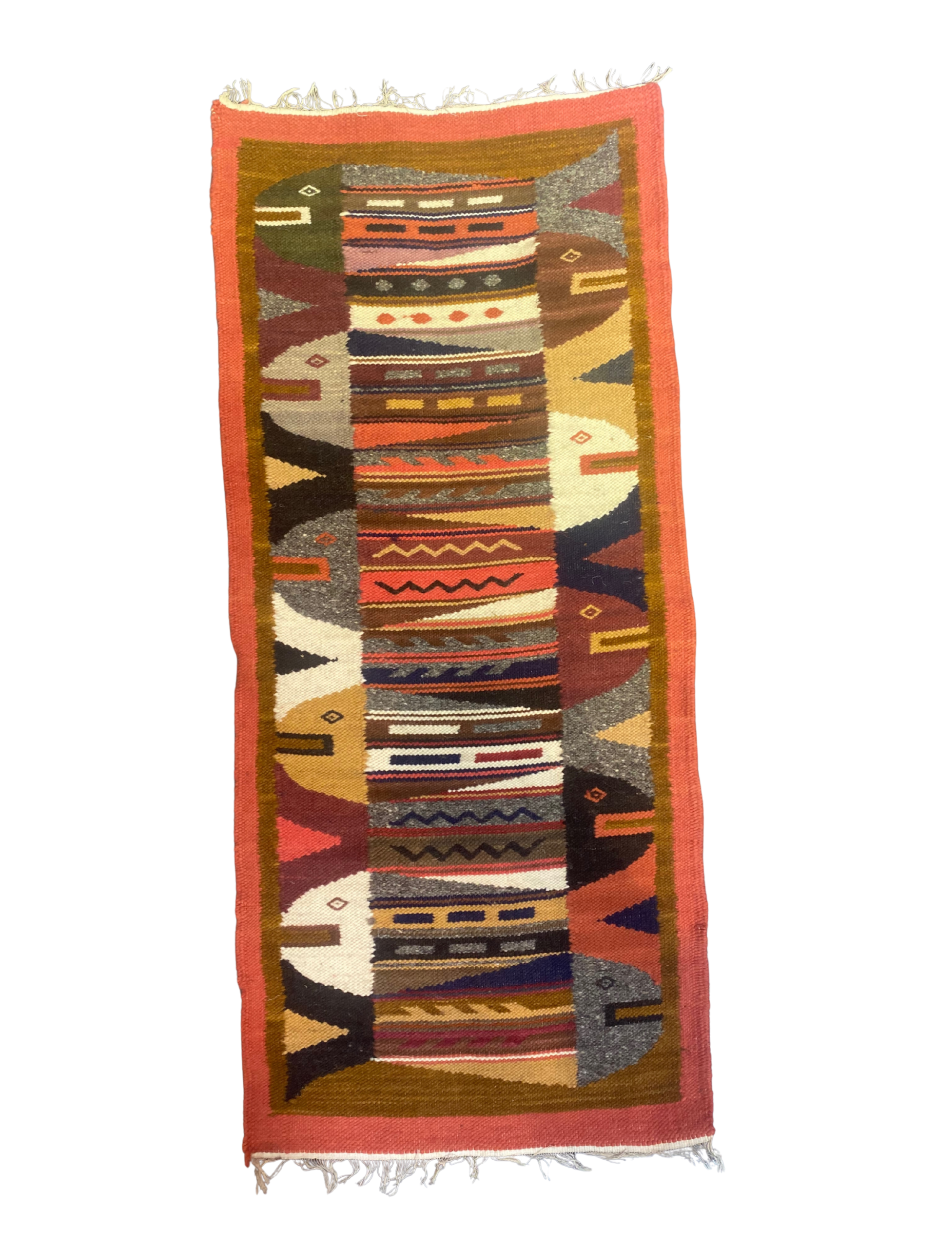 A charming vintage wool kilim rug from Ecuador, featuring a vibrant multicolor pattern inspired by traditional Oriental designs. Handwoven with care, this piece is rich in texture and character, perfect for adding warmth and artisanal charm to any space.